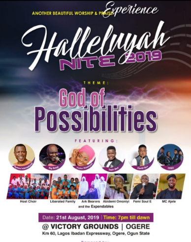 The ancient city of Ogere Remo, being the host community for the annual TABIEORAR FESTIVAL (PILGRIMAGE) also plays host and accommodates flocks of people from different nationalities and tribes during Halleluyah Nite and Tabieorar Festival. While the influx of people into the city is always on the rise between the Tabieorar period, these inflow of people triple on the 21st of August because of the arrival of teeming worshippers who make up HALLELUYAH NITE audience.